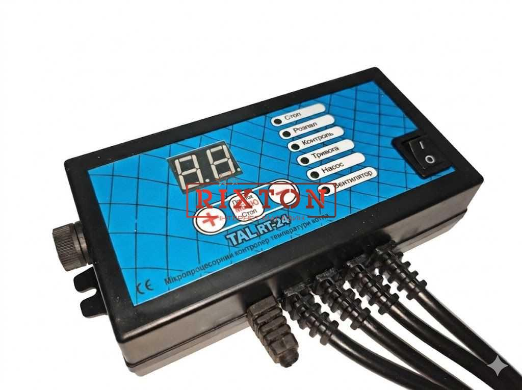 Блок управления котлом TAL RT-24 работает с насосом отопления и нагнетательным вентилятором. Контроллер TAL RT-24 позволяет устанавливать максимальные и минимальные обороты турбины, оптимизирующие мощность нагнетания вентилятора и обеспечивающие таким образом плавность регулировки температуры, поэтому TAL RT-24 совместим с разными видами вентиляторов.